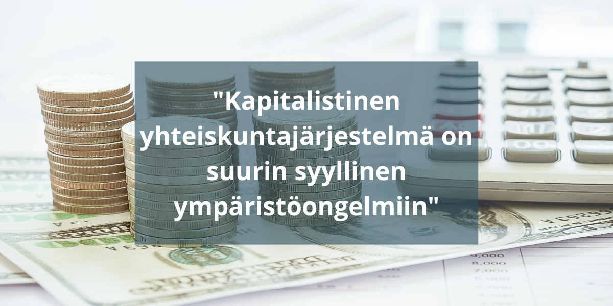 Väitän myös, että kapitalistinen yhteiskuntajärjestelmä on suurin syyllinen ympäristöongelmiin, koska voitontavoittelu on niin suurta. Sosialistisessa yhteiskuntajärjestelmässä voidaan hallita paremmin luonnonvarojen käyttöä ja teollisuuden vaikutuksia ympäristöön.