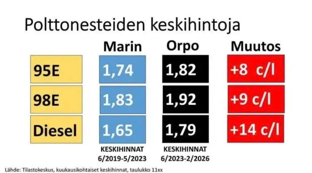 Ja jos tää ei jo riittäisi, niin nyt me saadaan maksaa myös globaalin imperialismin laskuja. Se sotahullu Trump meni sitten hyökkäämään Iraniin ja nyt koko Lähi-itä on ihan liekeissä. Mitä tää hallitus tekee? Se nyökkäilee kiltisti jenkkien suuntaan ja ihmettelee, miksi bensan hinta nousee täällä Suomessa, kun polttoainetta on entistä vaikeampi saada ja raakaöljyn hinta ampuu pilviin. Meidät on sidottu osaksi tätä imperialistista sotakonetta, ja suomalainen duunari on se, joka maksaa tankilla tän sotahulluuden hinnan. On aivan varmaa, että hinnat tulee nousemaan tästä vielä reilusti, ja Orpo ja Purra vaan levittelee käsiään ja syyttää maailmantilannetta, vaikka he itse on olleet viemässä meitä tähän suuntaan.